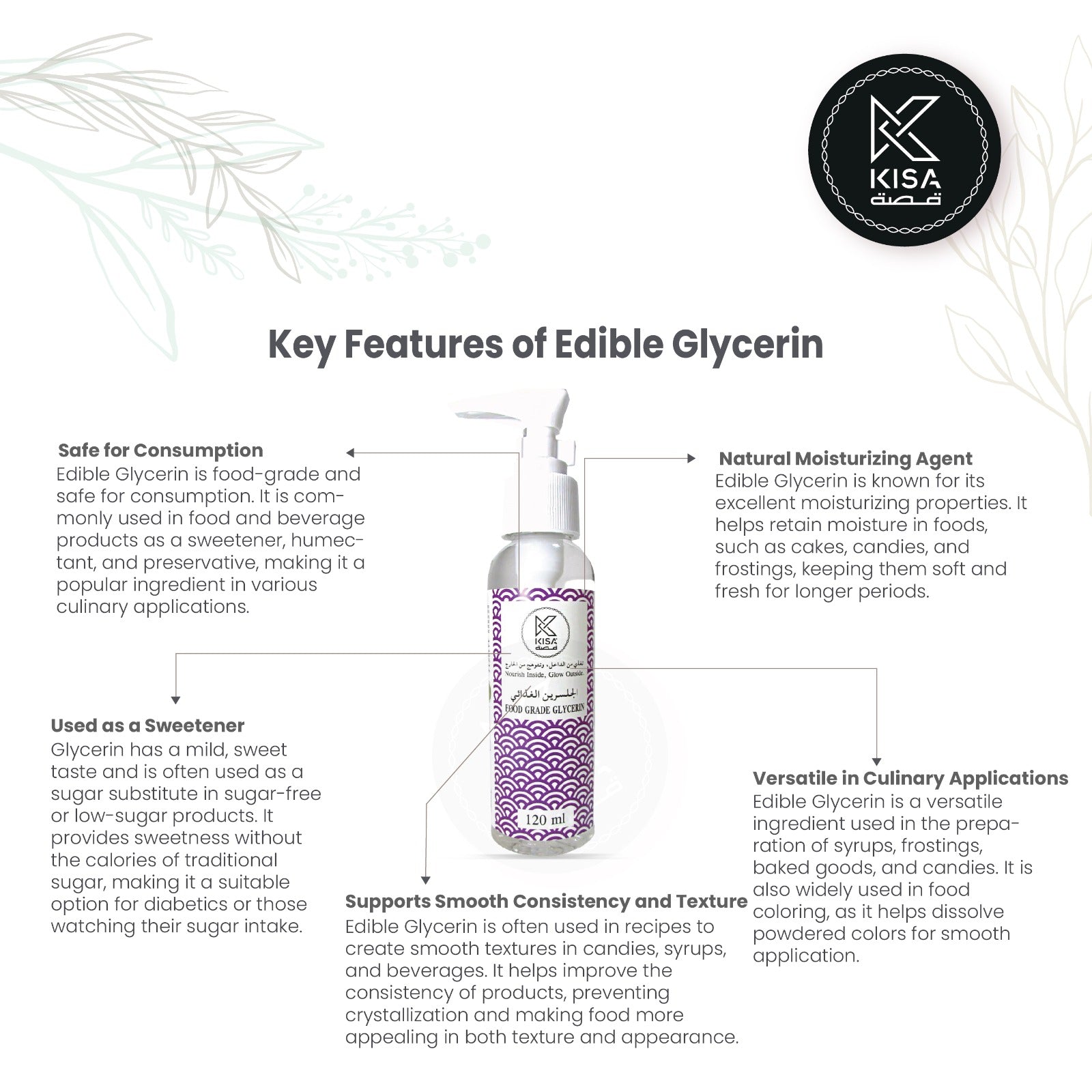 الجلسرين الغذائي هو سائل عديم اللون والرائحة مشتق من مصادر طبيعية، ويستخدم عادة كمحلي ومرطب ومادة حافظة في المنتجات الغذائية. وهو معروف بقدرته على الاحتفاظ بالرطوبة، ويساعد في تحسين الملمس وإطالة العمر الافتراضي للسلع المخبوزة والحلويات والمشروبات. بالإضافة إلى ذلك، فإن الجلسرين الغذائي آمن للاستهلاك ويُستخدم على نطاق واسع في الطهي والخبز، وكذلك في مستحضرات التجميل المنزلية ومنتجات العناية الشخصية. ويجعله تنوعه مكونًا أساسيًا في كل من التطبيقات الطهوية والعافية.