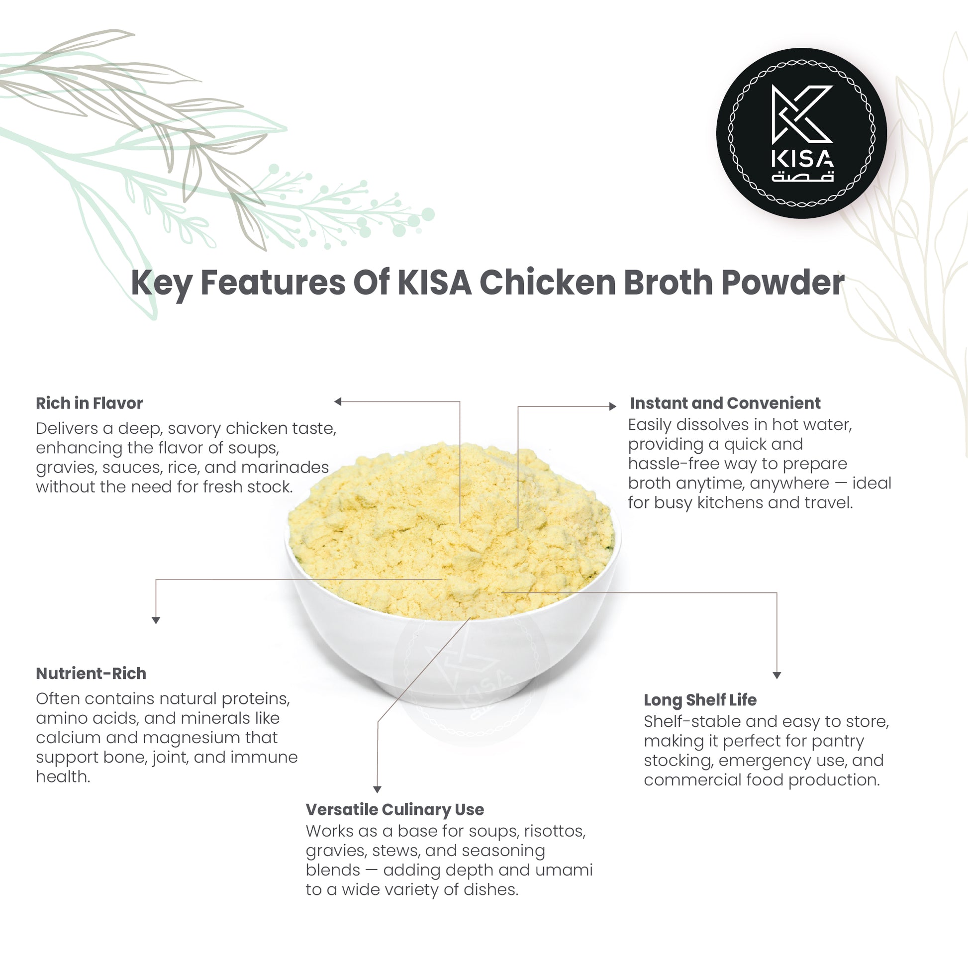 Chicken Broth Powder is a versatile and flavorful seasoning made by dehydrating savory chicken broth into a convenient, shelf-stable form. It captures the essence of slow-simmered chicken with aromatic herbs and vegetables, delivering rich taste instantly. Ideal for preparing quick, comforting soups and sipping broths, it dissolves easily in hot water to create a warm, nourishing base. You can also use it to enhance the flavor of rice, pasta, noodles, and couscous during cooking. Sprinkle it into stir-fries, sauces, gravies, or casseroles for an extra layer of depth without added effort. It serves as a great alternative to liquid broth when space or storage is limited. With its balanced seasoning and natural chicken taste, it’s a kitchen essential for both everyday meals and gourmet dishes. Whether you’re cooking at home or preparing instant meals, chicken broth powder brings convenience and flavor in one scoop.