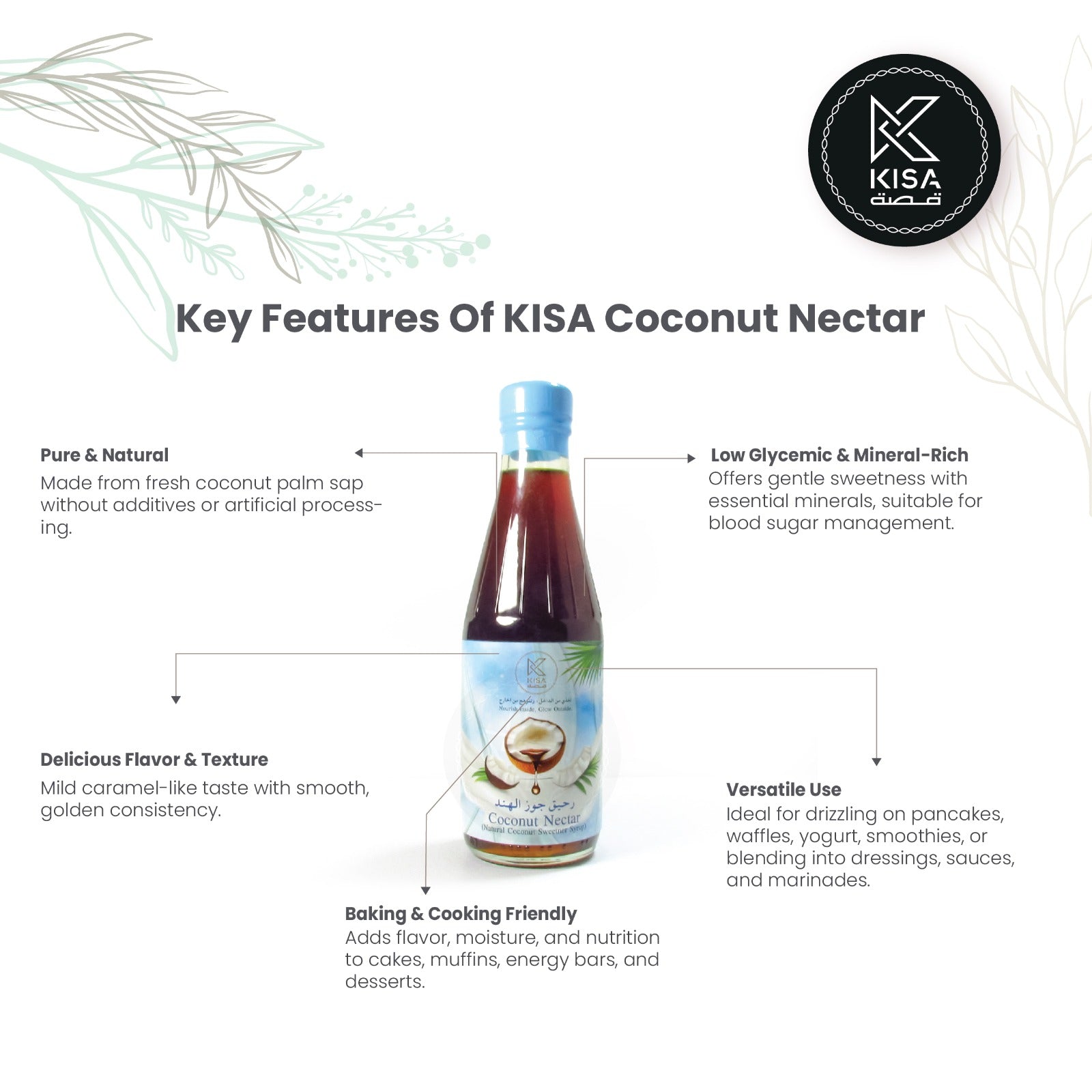 KISA Coconut Nectar is a pure and natural sweetener made from the fresh sap of the coconut palm, carefully crafted without additives or artificial processing. It has a mild caramel-like flavor and smooth, golden texture, making it a delicious and healthier alternative to refined sugar. Rich in minerals and naturally low on the glycemic index, it offers gentle sweetness without the spikes of regular sugar. This versatile nectar can be drizzled over pancakes, waffles, or crepes for a wholesome breakfast, or stirred into coffee, tea, or smoothies for a naturally sweet boost of energy. It also blends beautifully into salad dressings, marinades, and sauces, giving a touch of natural sweetness to savory dishes. Bakers love it as a moistening agent in cakes, muffins, and energy bars, where it adds both flavor and nutrition. Children enjoy it as a topping over yogurt, ice cream, or fruits, making it a guilt-free treat for families. From everyday cooking to creative desserts, this nectar adapts to countless recipes with ease, becoming a kitchen essential for health-conscious households. With every spoonful, KISA Coconut Nectar brings you the goodness of nature’s palms in its most authentic form. Truly, it is everyday natural sweetness redefined.