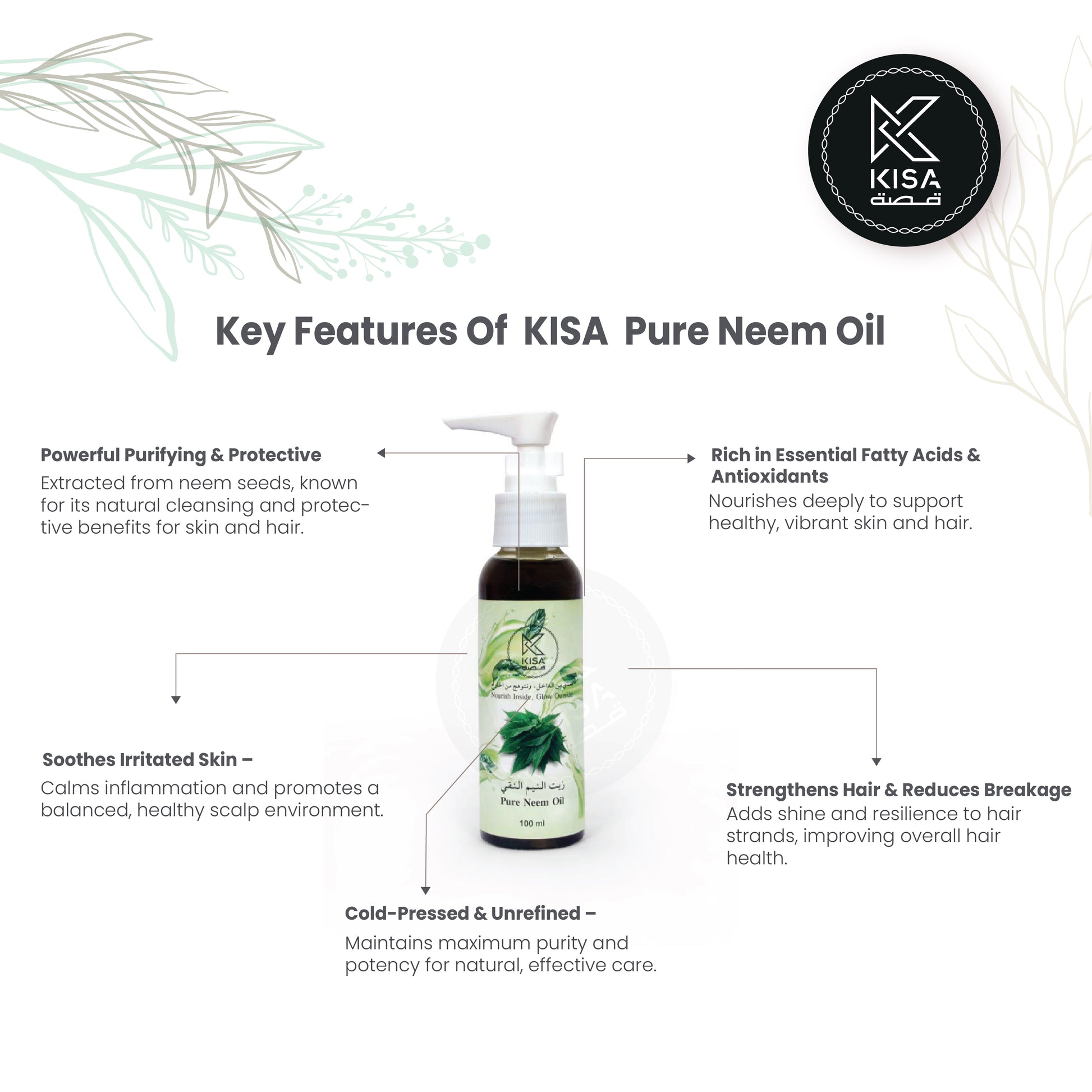 Pure neem oil is a natural extract obtained from the seeds of the neem tree, known for its powerful purifying and protective properties. Rich in essential fatty acids and antioxidants, it deeply nourishes the scalp and helps maintain overall hair and skin health. Its soothing nature helps calm irritated skin and supports a balanced, healthy scalp environment. When applied to hair, neem oil adds strength and shine while helping to reduce breakage. It also helps maintain scalp clarity and promotes a fresh, clean feeling. Cold-pressed and unrefined, this golden oil is a valuable addition to any natural care routine.