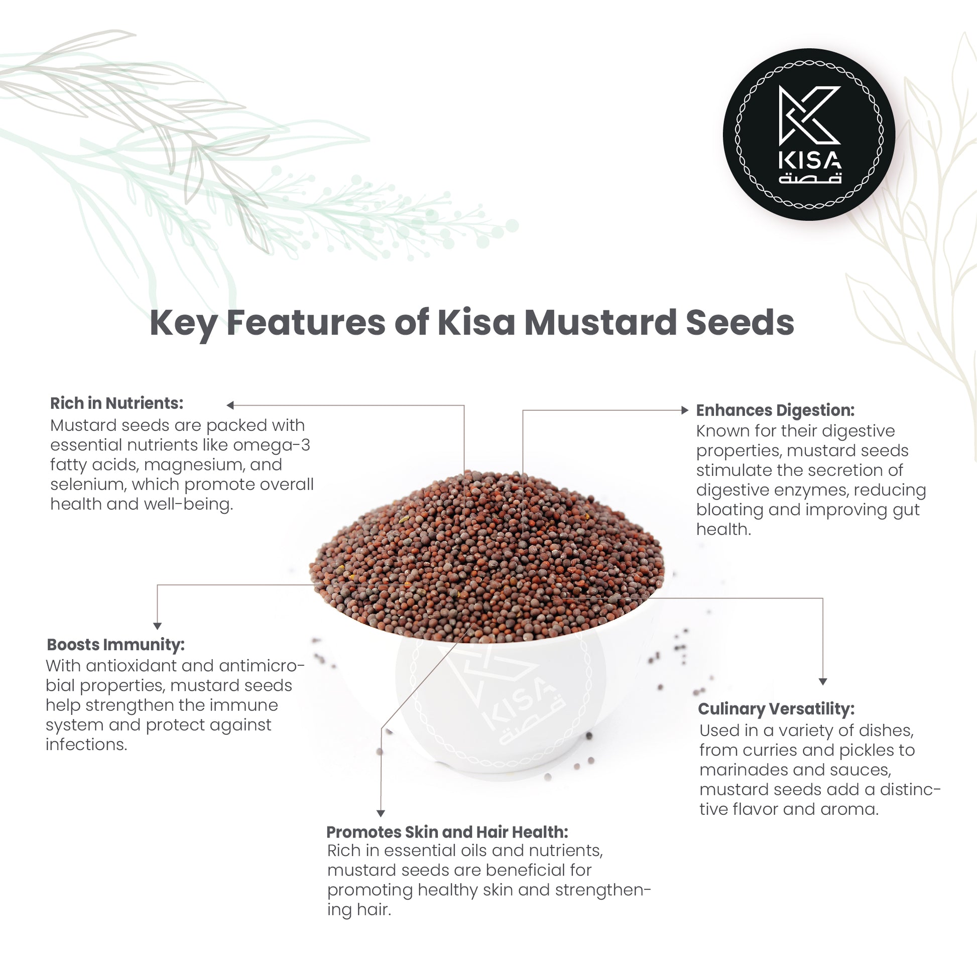 بذور الخردل هي بذور صغيرة مستديرة مشتقة من نبات الخردل، ومتوفرة بألوان مختلفة، بما في ذلك الأصفر والبني والأسود. تشتهر هذه البذور بنكهتها القوية واللاذعة، وهي عنصر أساسي في المطابخ في جميع أنحاء العالم، وتستخدم عادة في التخليل والتوابل وكمكون رئيسي في التوابل مثل الخردل. بذور الخردل غنية بالزيوت الأساسية ومضادات الأكسدة والدهون الصحية، كما تقدم فوائد صحية مختلفة، بما في ذلك خصائص مضادة للالتهابات والجهاز الهضمي. سواء تم استخدامها كاملة أو مطحونة أو كزيت، تضيف بذور الخردل نكهة لذيذة وعمقًا لمجموعة متنوعة من الأطباق.