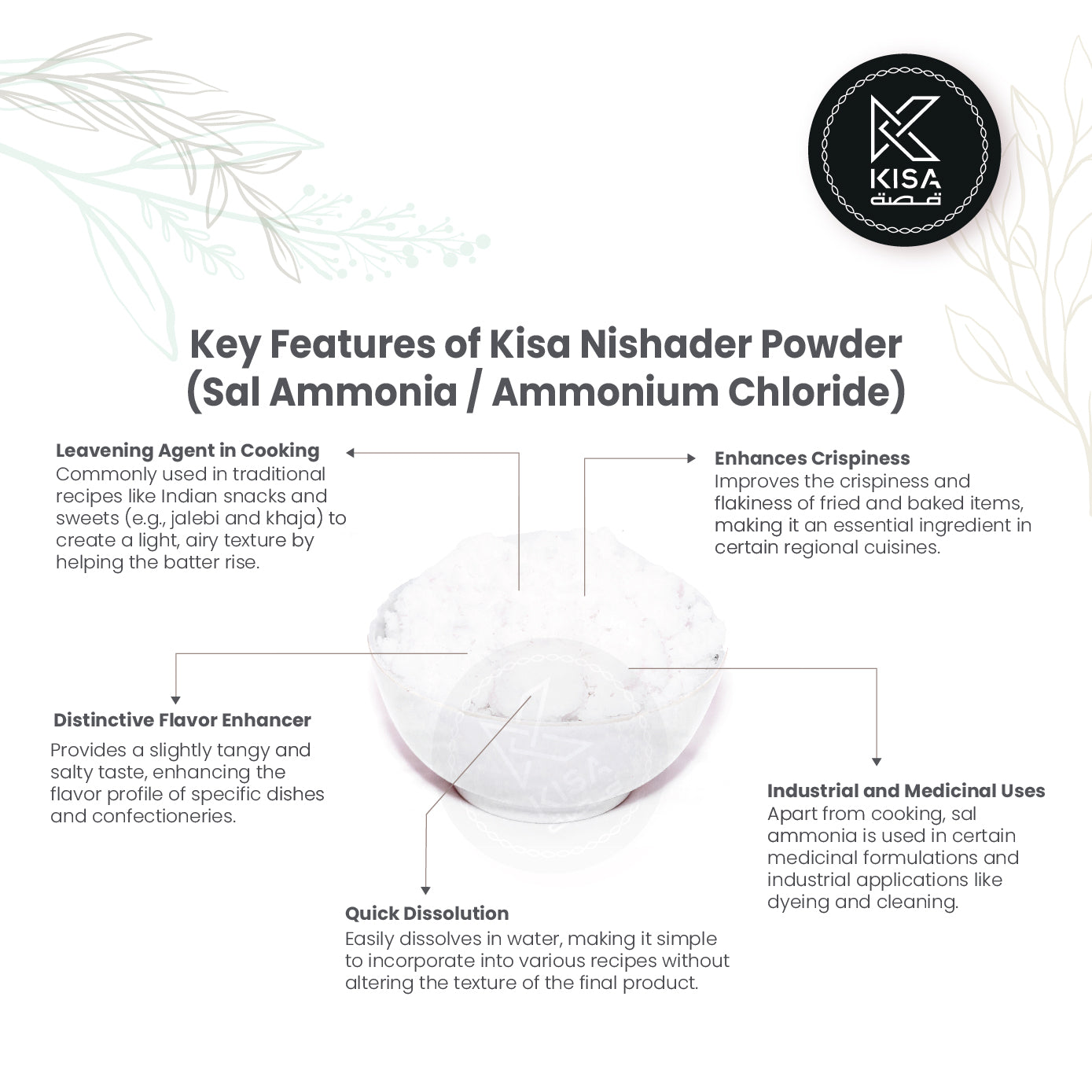 مسحوق نيشادر، المعروف أيضًا باسم مسحوق كلوريد الأمونيوم أو ملح الأمونيا، هو مكون متعدد الاستخدامات يستخدم عادةً في التطبيقات الطهوية. يتميز بطعم مالح مميز ومرير قليلاً، وغالبًا ما يتم استخدامه في الوصفات التقليدية لتعزيز النكهة والعمل كعامل تخمير في بعض أنواع الخبز والمعجنات. بالإضافة إلى استخداماته الطهوية، يمكن أن يساعد مسحوق نيشادر في تحسين ملمس الأطباق ويُستخدم أحيانًا في التخليل والحفظ. تجعله خصائصه الفريدة إضافة قيمة إلى مختلف المأكولات، مما يضفي لمسة من التقليد والعمق على إبداعاتك الطهوية.