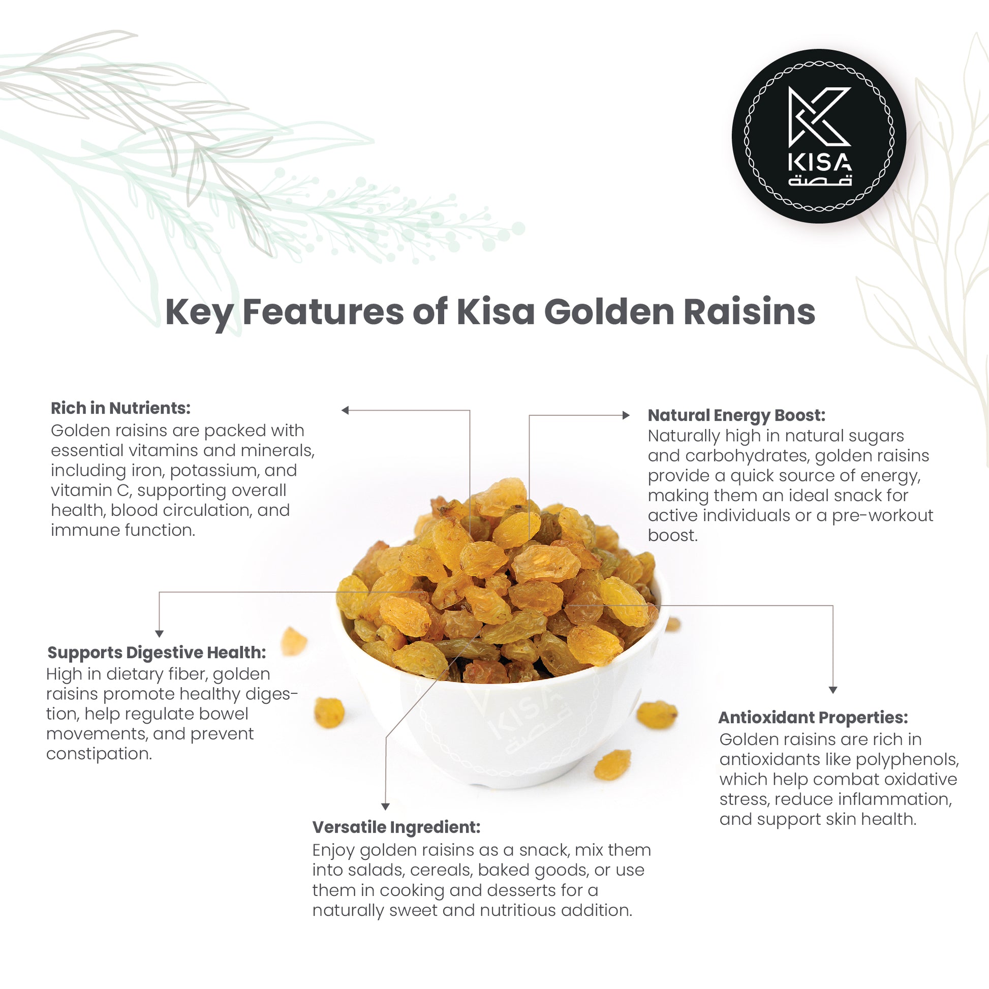 الزبيب الذهبي هو عنب مجفف بالشمس، مصنوع عادة من عنب طومسون الخالي من البذور، والمعروف بطعمه الحلو والفواكهي وقوامه المطاطي. لونه الذهبي المشرق وحلاوته الغنية يجعله إضافة رائعة لمجموعة متنوعة من الأطباق، بما في ذلك المخبوزات والسلطات ومزيج المكسرات. الزبيب الذهبي المليء بالعناصر الغذائية الأساسية، بما في ذلك الألياف والفيتامينات ومضادات الأكسدة، يوفر خيارًا صحيًا ومريحًا للوجبات الخفيفة. تعزز حلاوته الطبيعية كل من الوصفات الحلوة والمالحة، مما يجعله عنصرًا أساسيًا متعدد الاستخدامات في المؤن.