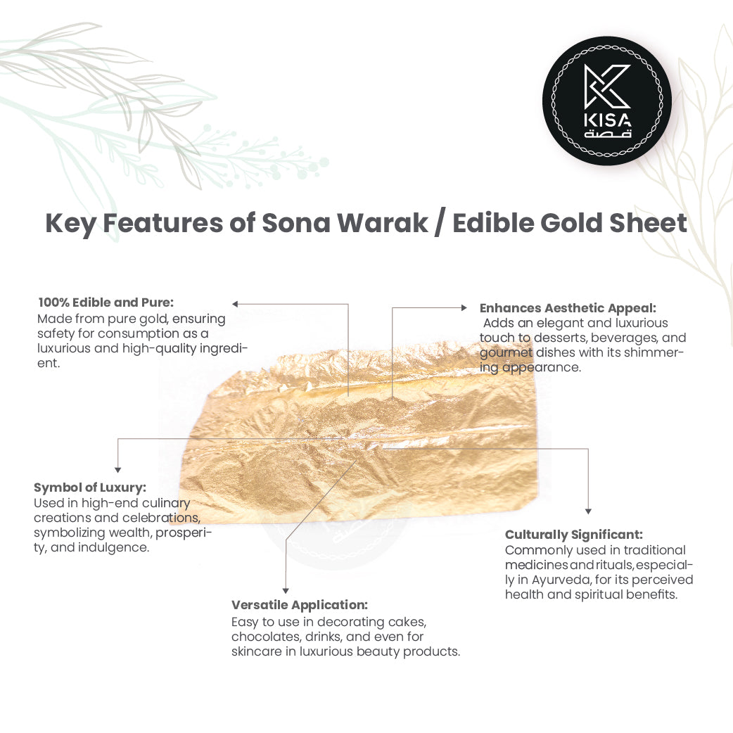 تُعَد رقائق الذهب الصالحة للأكل من سونا وراك، أو رقائق الذهب الصالحة للأكل، عبارة عن رقائق ذهبية رقيقة صالحة للأكل تُستخدم لإضافة لمسة من الفخامة والأناقة إلى الإبداعات الطهوية. تُستخدم رقائق الذهب هذه تقليديًا في الحلويات الهندية والشرق أوسطية، مثل الحلويات والكعك والمعجنات، وتعزز من الجاذبية البصرية للأطباق بمظهرها اللامع والفخم. تُستخدم رقائق الذهب الفاخرة هذه، الآمنة للاستهلاك، غالبًا في المناسبات الاحتفالية والاحتفالات لرفع مستوى تقديم الأطعمة الشهية. بفضل أهميتها الثقافية الغنية وجمالياتها المذهلة، تعد رقائق الذهب سونا وراك خيارًا شائعًا لأولئك الذين يتطلعون إلى إبهار الجميع بفنونهم الطهوية.