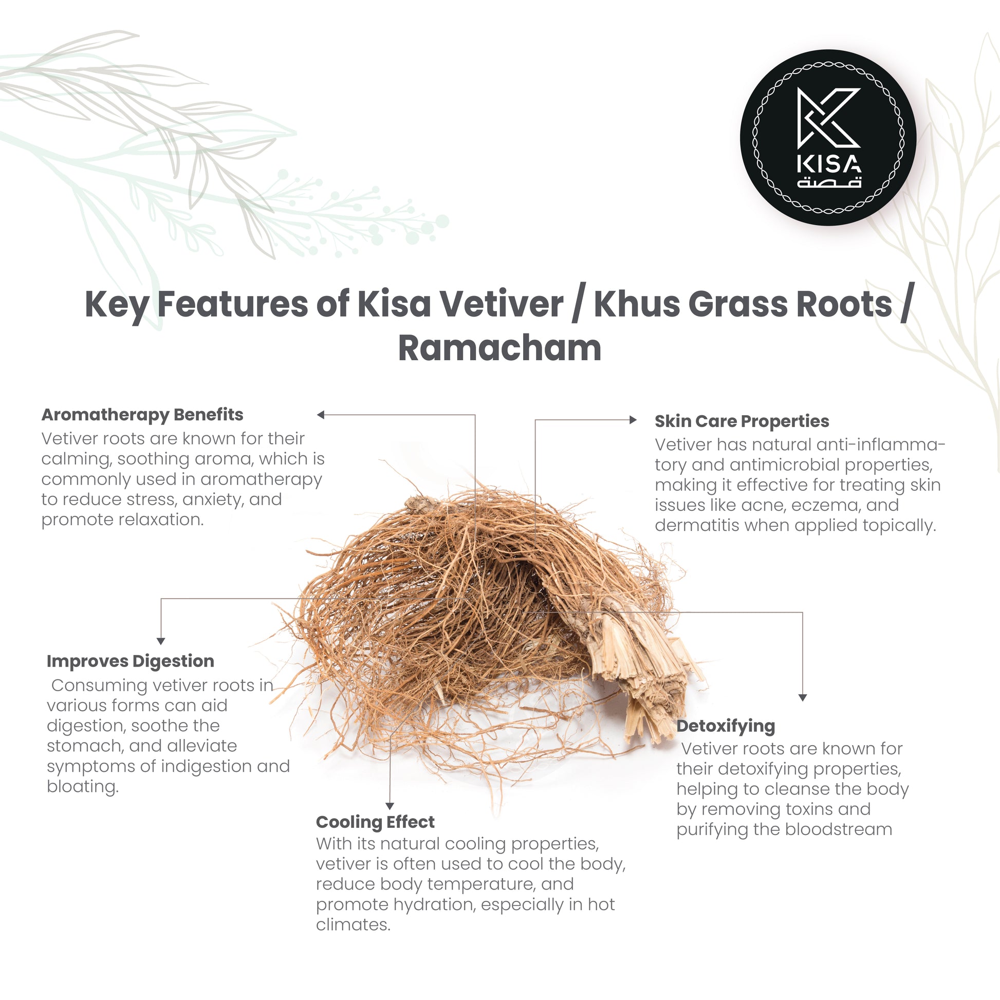 Vetiver / Khus Grass roots / രാമചം is a versatile and aromatic grass with roots offering numerous therapeutic and culinary benefits. Known as the “oil of tranquility,” it is widely used to calm the mind, reduce stress, and promote restful sleep. Vetiver is celebrated for its skin-soothing properties, helping to hydrate dry skin, reduce irritation, and fade scars and blemishes. The roots are edible and commonly used to flavor beverages, syrups, and desserts, while vetiver-infused water or sherbet is valued for its cooling and detoxifying properties. Its natural antimicrobial qualities make it ideal for maintaining a healthy scalp, combating dandruff, and strengthening hair roots. Additionally, vetiver root is brewed into herbal teas for its calming and digestive benefits, making it a treasured ingredient for skincare, haircare, and holistic wellness practices.
