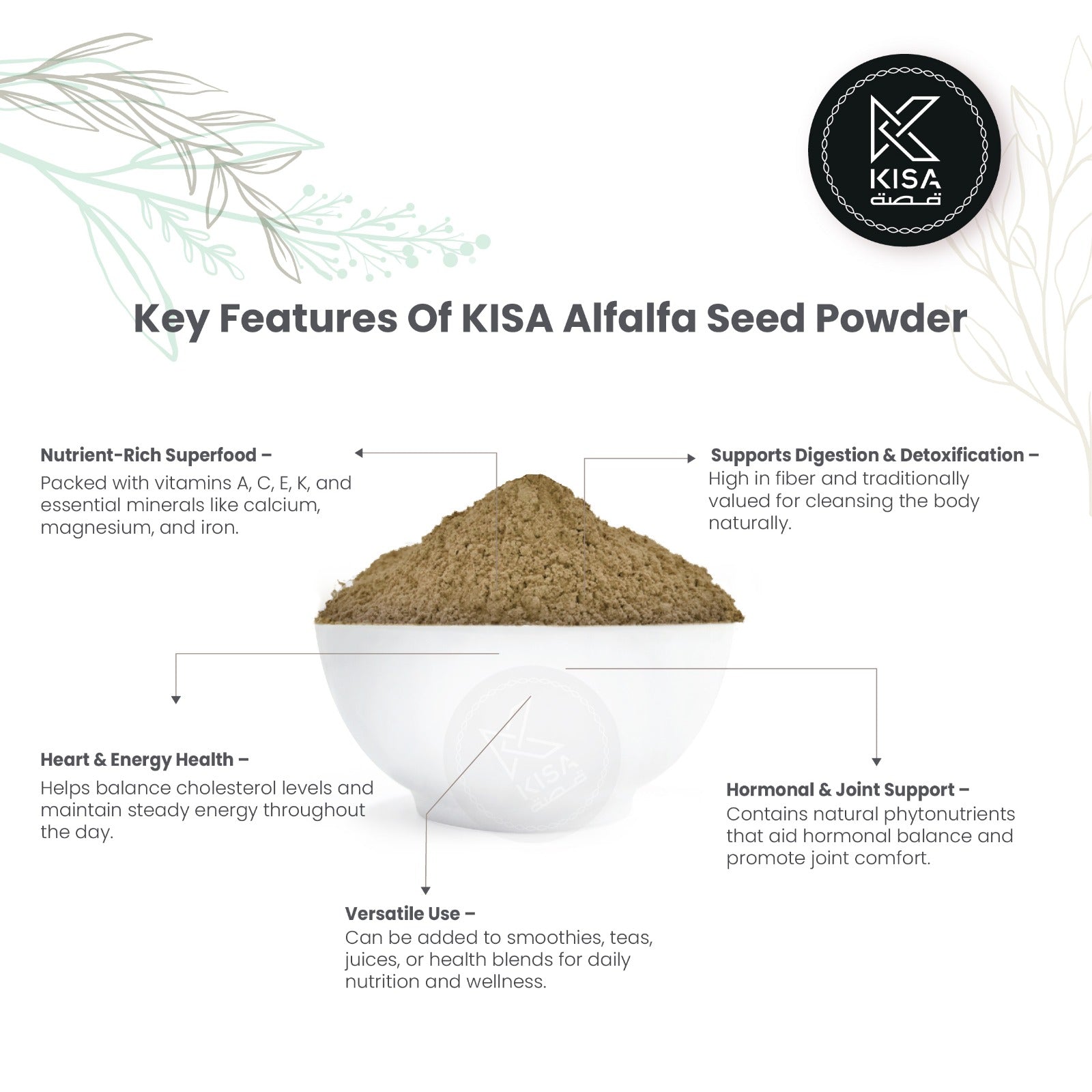 KISA Alfalfa Seed Powder is a nutrient-dense superfood made from finely ground, premium quality alfalfa seeds, cherished for their mild, nutty flavor and powerful health benefits. Rich in essential vitamins A, C, E, and K, along with minerals like calcium, magnesium, and iron, it provides natural nourishment for energy and vitality. Its high protein and fiber content make it an excellent addition to daily nutrition, supporting digestive health and overall wellness. Traditionally valued for its ability to promote detoxification, it helps cleanse the body and support healthy liver and kidney function. Alfalfa seed powder is also known to help balance cholesterol levels, contributing to better heart health. It may assist in regulating blood sugar, making it a natural choice for balanced energy throughout the day. With natural phytonutrients, it supports hormonal balance and is often valued for easing menopausal discomforts. In traditional practices, it has been used to promote joint comfort and reduce inflammation. Easy to incorporate into smoothies, juices, teas, or health blends, it adds both nutrition and flavor to everyday diets. Versatile and wholesome, KISA Alfalfa Seed Powder is a natural way to nourish, energize, and rejuvenate the body.