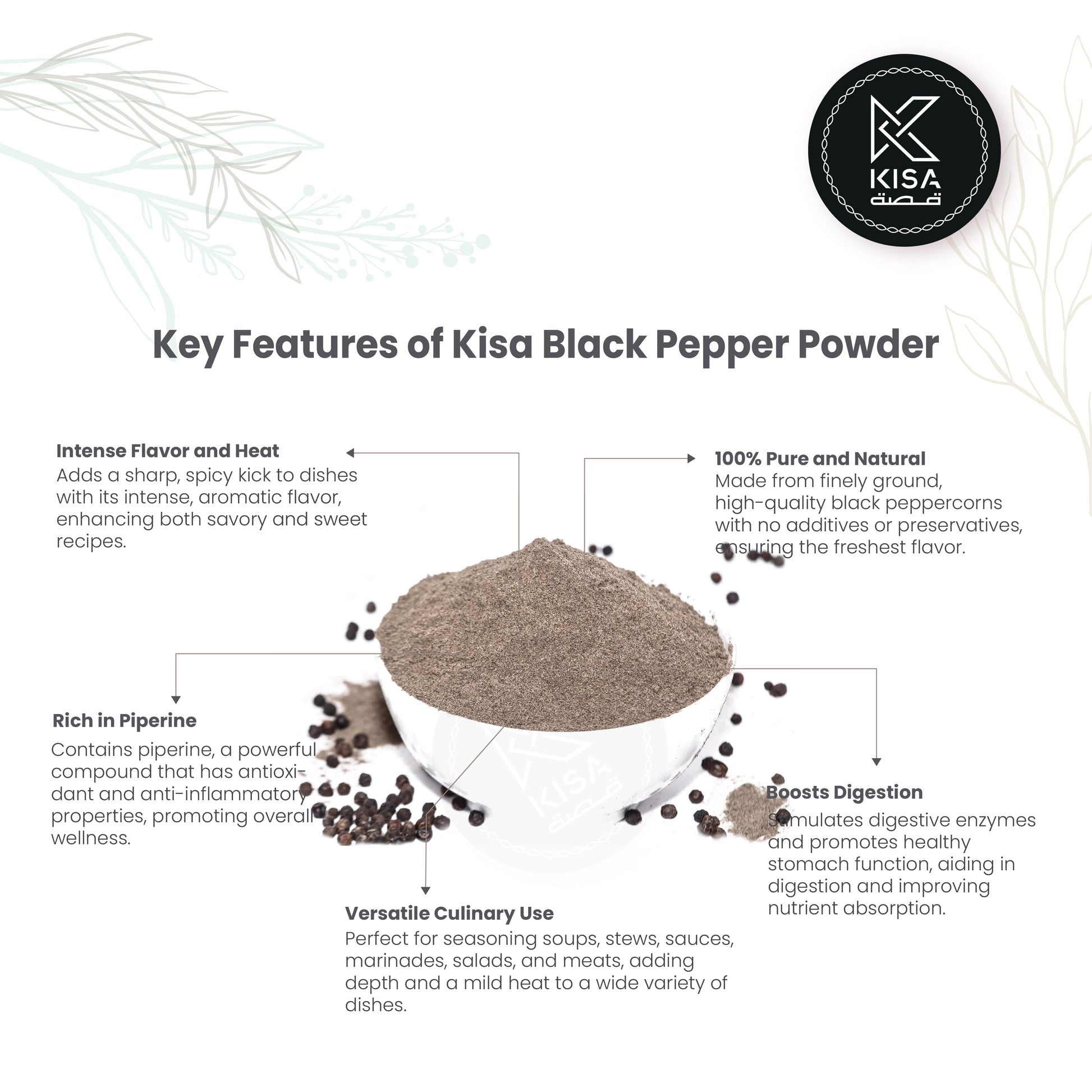 Pure black pepper, often referred to as “the king of spices,” is derived from the dried berries of the Piper nigrum plant. Renowned for its bold flavor and pungent aroma, black pepper is a staple in kitchens worldwide, enhancing a wide variety of dishes, from savory to sweet. Its rich, complex taste profile adds warmth and depth, making it an essential seasoning in numerous cuisines.Beyond its culinary uses, pure black pepper is celebrated for its health benefits. It contains piperine, a compound known for its antioxidant properties and potential to enhance nutrient absorption. Black pepper has also been traditionally used for its anti-inflammatory effects and digestive support. Whether used whole, ground, or as a seasoning, pure black pepper not only elevates the flavor of meals but also contributes to overall health, making it a must-have in every pantry.
