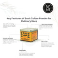 Bush color powders, in shades of yellow and red, are natural food colorings derived from plants, fruits, or spices. These vibrant powders are often used in traditional cuisines to enhance the appearance and appeal of dishes without synthetic additives.Yellow bush color powder typically comes from sources like turmeric, saffron, or marigold flowers, offering not only a warm golden hue but also potential health benefits due to their antioxidant and anti-inflammatory properties. Red bush color powder is commonly sourced from beetroot, paprika, or annatto seeds, adding a rich, earthy red tone to dishes while contributing nutrients like vitamins and minerals.These powders are ideal for adding color to sauces, rice, soups, and baked goods, while being a healthier alternative to artificial food dyes.