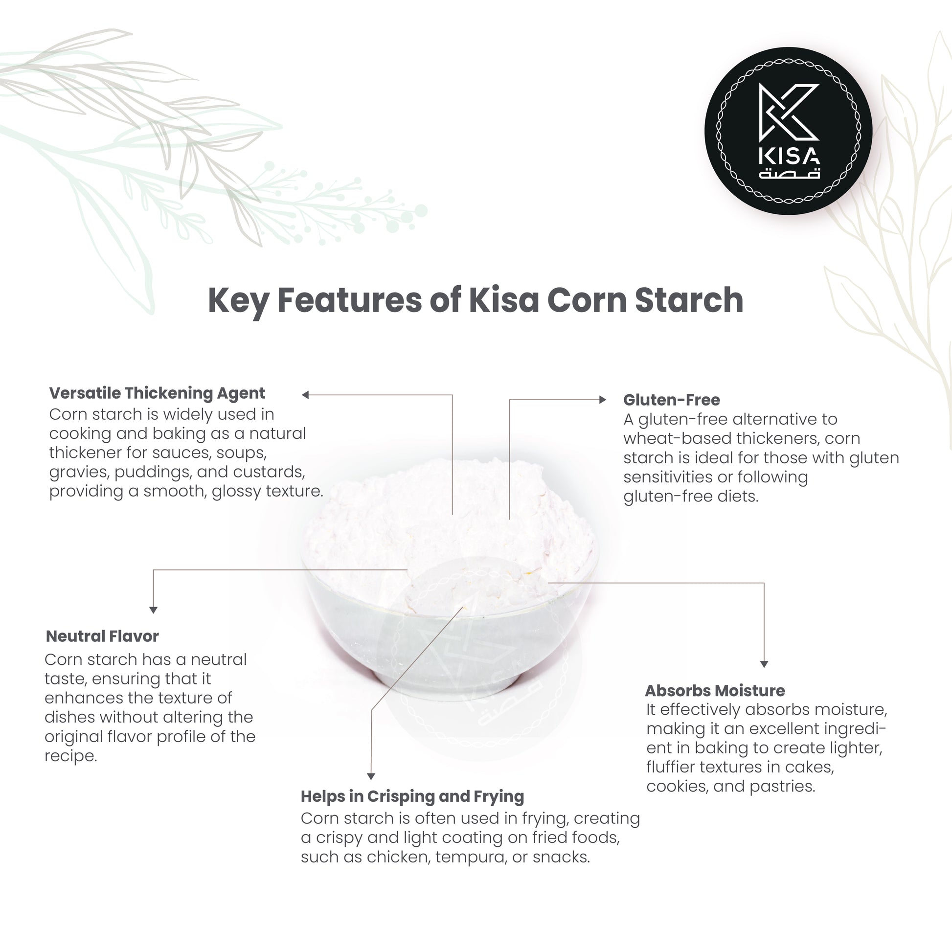Corn starch powder is a fine, white powder derived from the starchy part of corn kernels. It is widely used as a thickening agent in cooking, helping to give soups, sauces, and gravies a smooth, glossy texture. Beyond the kitchen, corn starch is also used in baking for light, tender cakes, and as a natural ingredient in skincare products for soothing irritation and absorbing moisture. Its versatility and neutral taste make it a staple in both culinary and household applications.