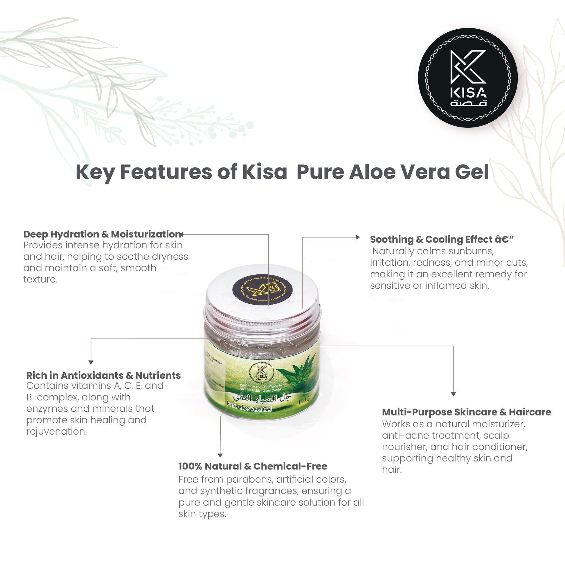 Kisa pure and 100% natural aloe vera gel is a soothing and hydrating product derived from the leaves of the aloe vera plant. Known for its remarkable healing properties, this gel is rich in vitamins, minerals, and antioxidants, making it perfect for calming irritated skin, moisturizing dry areas, and promoting a healthy complexion. Its lightweight, non-greasy formula absorbs quickly, providing instant relief from sunburn, minor cuts, and dryness. Free from additives and preservatives, Kisa aloe vera gel offers a pure, natural solution for skincare enthusiasts seeking gentle and effective hydration.