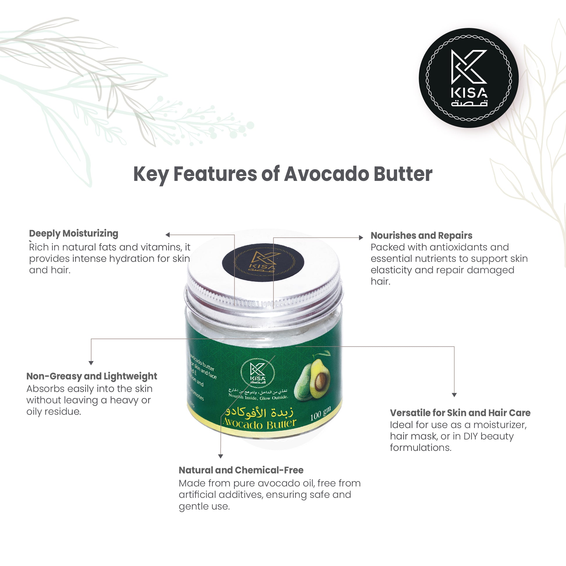 Avocado butter is a rich, creamy substance derived from the flesh of ripe avocados, typically blended with oils and other natural ingredients to achieve a smooth texture. Renowned for its deep moisturizing properties, avocado butter is packed with vitamins A, D, and E, as well as healthy fats, making it an excellent choice for nourishing and hydrating the skin. It is commonly used in cosmetics, lotions, and hair care products for its ability to promote elasticity, soothe irritation, and provide a protective barrier against environmental damage. Its lightweight consistency allows for easy absorption, making avocado butter a versatile ingredient for both skincare and haircare formulations, as well as a luxurious addition to homemade beauty recipes.