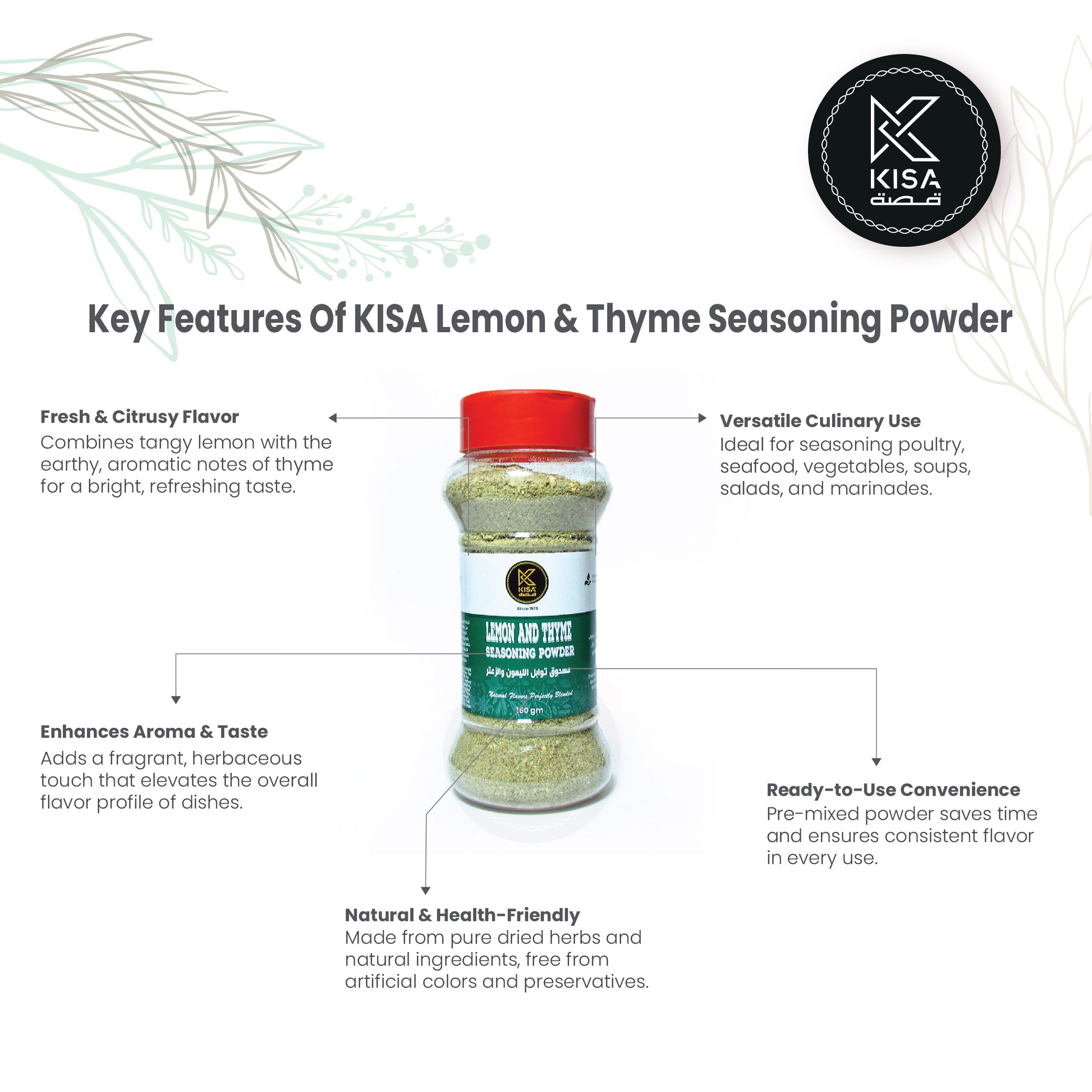 Kisa Lemon & Thyme Seasoning is a bright and aromatic blend of zesty lemon peel and fragrant thyme, crafted to elevate the flavor of a wide variety of dishes. This refreshing seasoning adds a natural, tangy, and herbal touch to meats, seafood, vegetables, salads, and dressings, making everyday meals vibrant and flavorful. Its natural ingredients are rich in antioxidants and beneficial compounds that may support digestion, boost immunity, and promote overall wellness. A simple sprinkle can enhance roasted chicken, grilled fish, or sautéed vegetables with a fresh, Mediterranean-inspired taste. It can also be mixed with olive oil or butter to create quick marinades or finishing sauces. The citrusy notes of lemon brighten flavors, while thyme adds earthy depth, creating a perfectly balanced seasoning. Kisa Lemon & Thyme is versatile enough for soups, pasta, rice dishes, and even baked goods, adding subtle aroma and flavor. Its natural, additive-free formulation ensures clean, wholesome seasoning for healthier cooking. Using this blend reduces the need for heavy sauces or artificial flavorings, keeping meals light and refreshing. Kisa Lemon & Thyme Seasoning is the perfect choice for home cooks who want effortless flavor, vibrant aroma, and wholesome goodness in every dish.