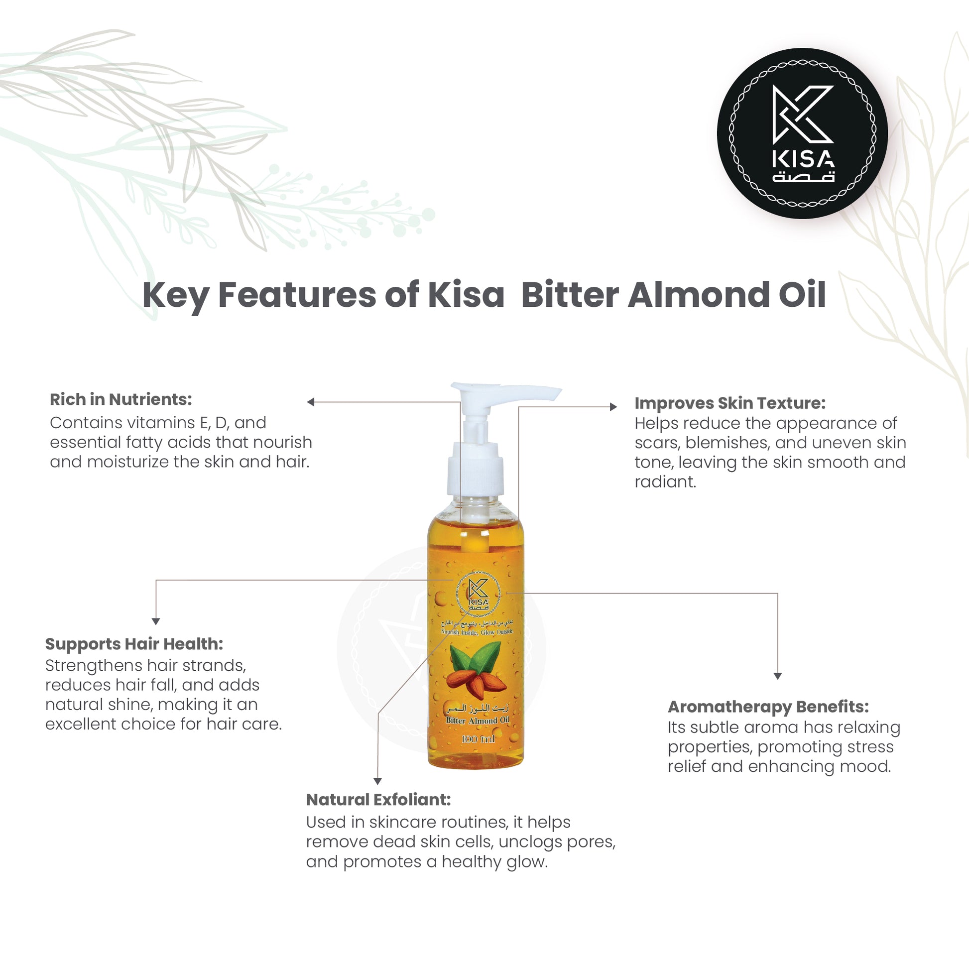 Kisa pure and 100% natural bitter almond oil is a high-quality oil extracted from bitter almonds, known for its distinct aroma and therapeutic properties. Often used in aromatherapy and skincare, this oil is valued for its potential to soothe the skin and provide a calming effect. With its rich content of vitamins and antioxidants, Kisa bitter almond oil can help improve skin tone and texture while offering a unique flavor in culinary applications, such as in pastries and confections. Free from additives and preservatives, this pure and natural oil is a versatile addition to your beauty and culinary routines