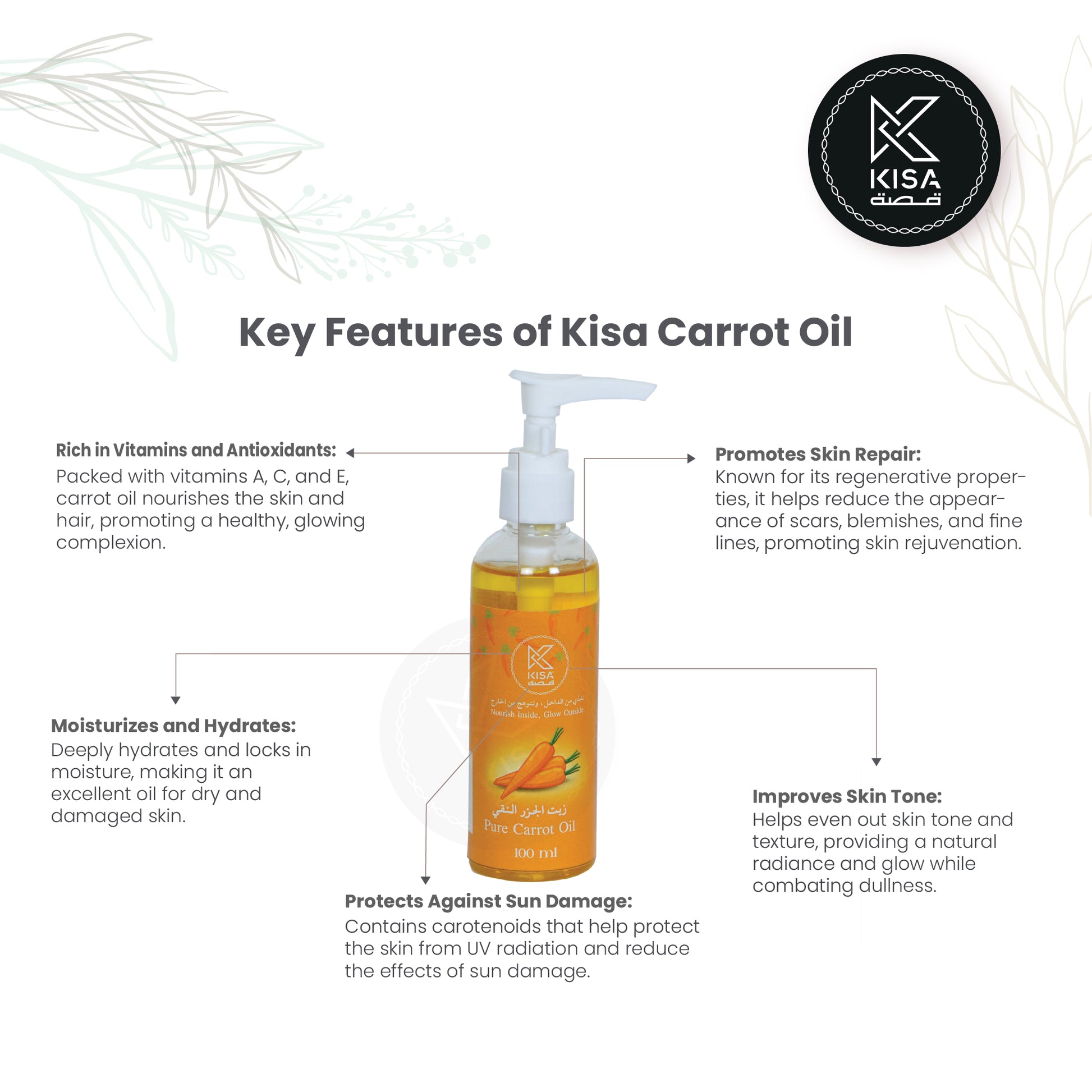 Kisa pure and 100% natural carrot oil is a nourishing oil derived from the seeds and roots of carrots, celebrated for its rich content of beta-carotene and antioxidants. This versatile oil is ideal for skincare, helping to promote a healthy glow and improve skin tone while providing deep hydration. Its light texture makes it perfect for hair care as well, enhancing shine and manageability. Free from additives and preservatives, Kisa carrot oil offers a pure and natural solution for those looking to elevate their beauty routine with the wholesome benefits of carrots.
