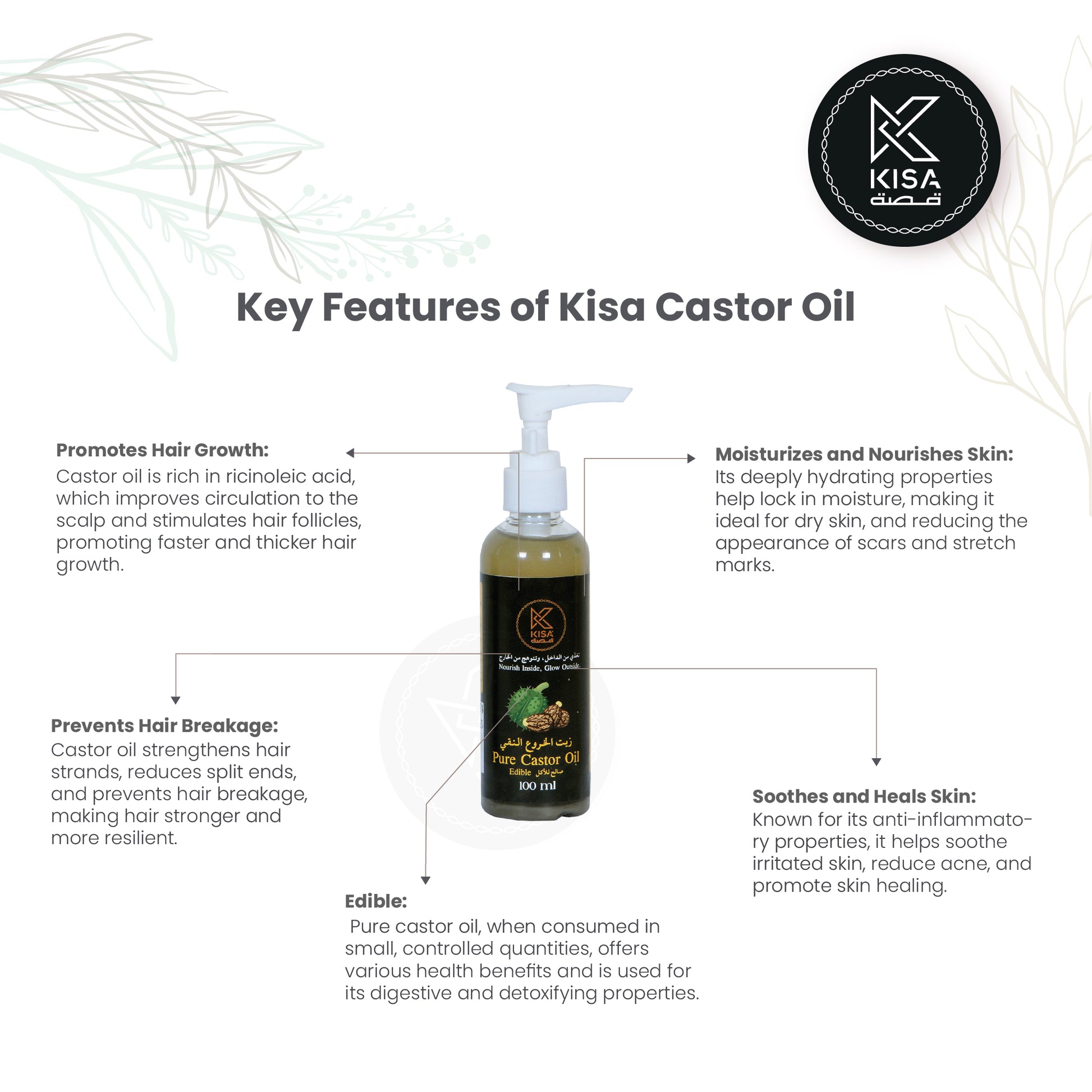 Kisa pure and 100% natural castor oil is a versatile oil extracted from premium castor beans, celebrated for its moisturizing and nourishing properties. Ideal for cosmetic uses, it promotes healthy hair growth, softens skin, and enhances hydration, making it a valuable addition to beauty routines. Additionally, this oil can be used in small amounts for edible applications, such as in cooking and baking, where it acts as a natural emulsifier. Free from additives and preservatives, Kisa castor oil offers a pure and natural option for enhancing both your beauty and culinary endeavors