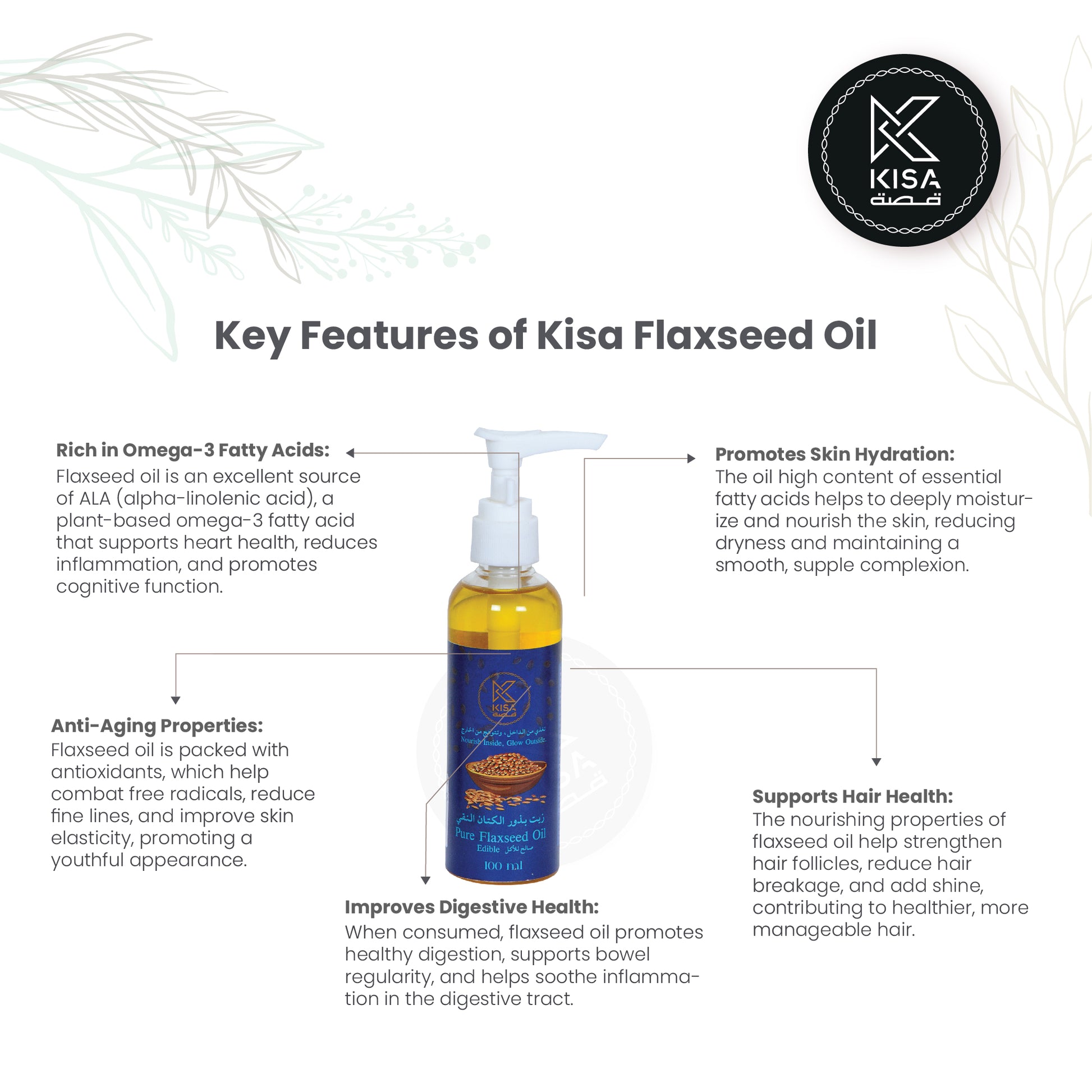 Kisa pure and 100% natural flax seed oil is a nutrient-rich oil extracted from high-quality flax seeds, celebrated for its abundant omega-3 fatty acids and antioxidants. In cosmetic applications, this oil helps to nourish and hydrate the skin, promoting a healthy complexion and supporting hair health. For culinary uses, Kisa flax seed oil adds a nutty flavor to smoothies, salads, and baked goods, making it a delicious and healthful addition to your diet. Free from additives and preservatives, this pure and natural oil is an excellent choice for enhancing both your beauty routine and culinary creations.