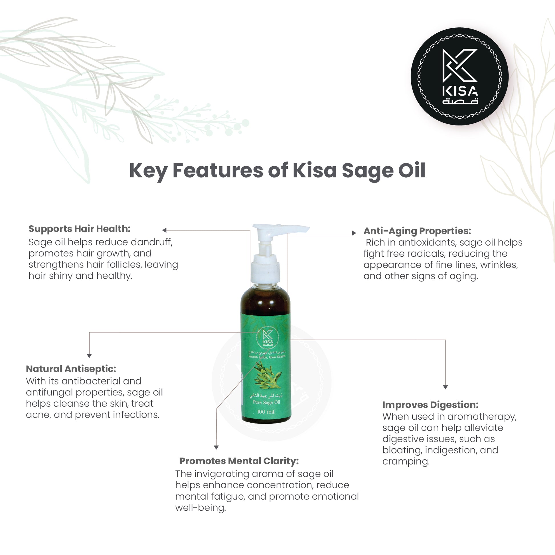 Kisa 100% Pure and Natural Sage Oil—also known as زيت أوراق المريمية (Zayt Awraq Al-Marimiyya—is a premium essential oil derived from the aromatic leaves of the sage plant. Revered for its cleansing and purifying properties, this oil enhances mental clarity, reduces stress, and fosters emotional well-being. Perfect for use in aromatherapy, skin care, and holistic practices, Kisa's sage oil is free from additives and synthetic ingredients, ensuring a truly authentic experience. Embrace the earthy, revitalizing aroma of Maramiya Oil to elevate your senses and create a serene atmosphere.