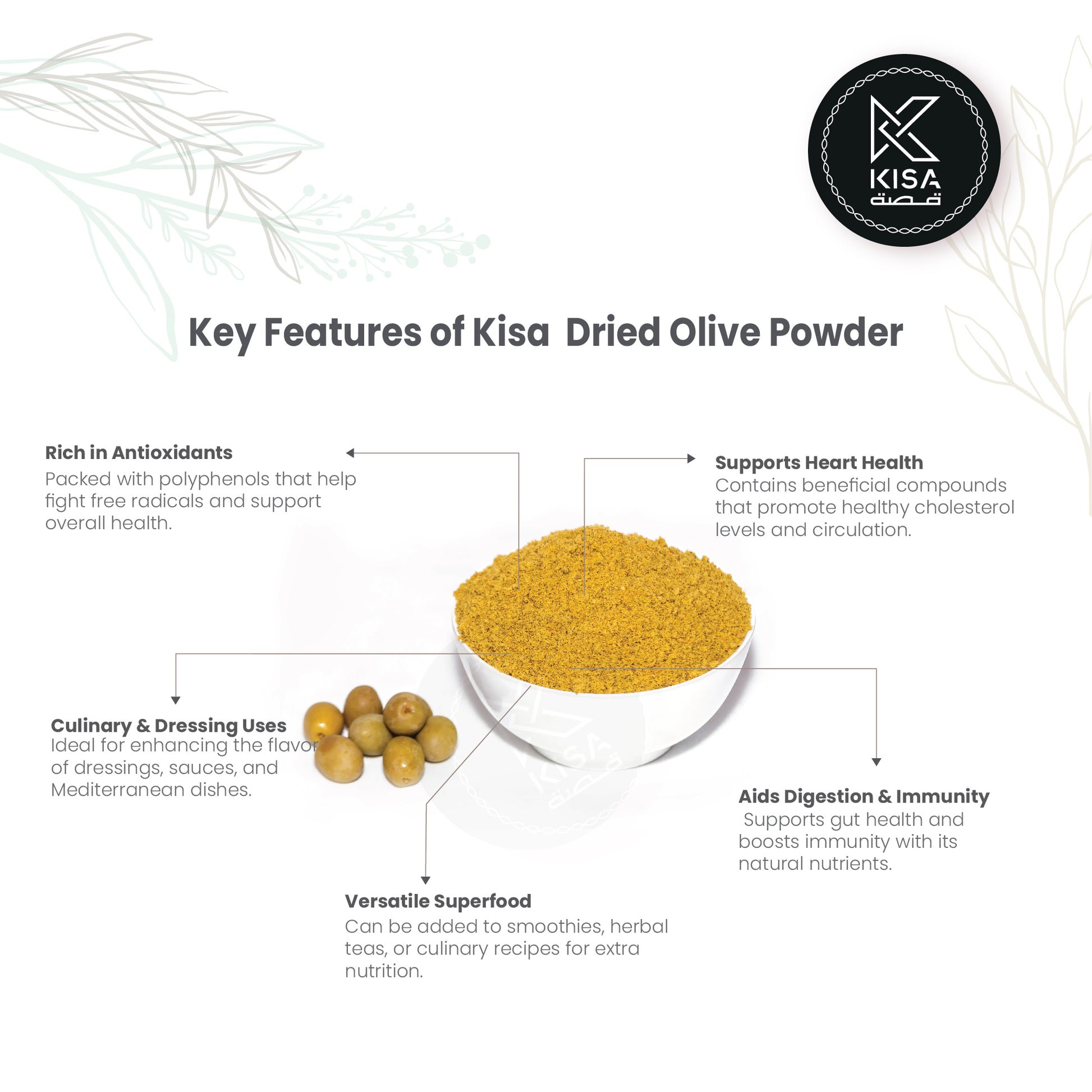 Pure Olive Powder is a nutrient-dense, all-natural powder made from finely ground, sun-dried olives. Packed with essential vitamins, antioxidants, and healthy fats, this powder offers a convenient way to incorporate the health benefits of olives into your daily routine.Rich in vitamin E, polyphenols, and healthy monounsaturated fats, Pure Olive Powder supports heart health, skin nourishment, and anti-inflammatory benefits. It helps to improve digestion, boost immunity, and promote healthy hair. This versatile powder can be used in smoothies, salads, or as a flavoring agent in cooking, adding both nutrition and a mild olive taste to your dishes.