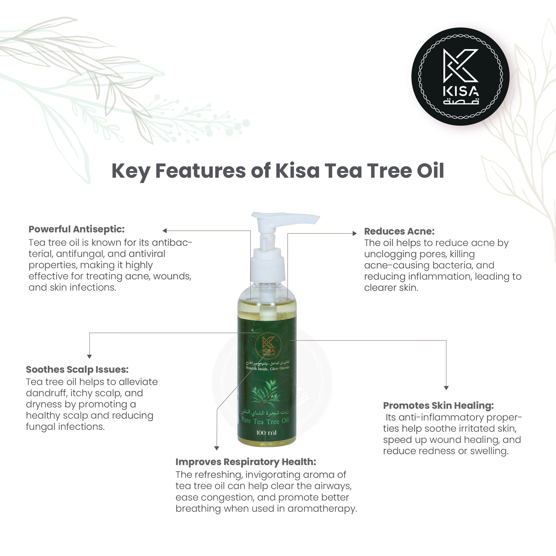 Kisa pure and 100% natural tea tree oil is a potent essential oil extracted from the leaves of the Melaleuca alternifolia tree. Renowned for its antibacterial, antifungal, and anti-inflammatory properties, this versatile oil is ideal for treating various skin concerns, including acne, blemishes, and irritation. Its refreshing scent and natural purifying qualities make it a popular choice for skincare and wellness products. Free from additives and preservatives, Kisa tea tree oil offers a pure, effective solution for maintaining healthy skin and promoting overall well-being.